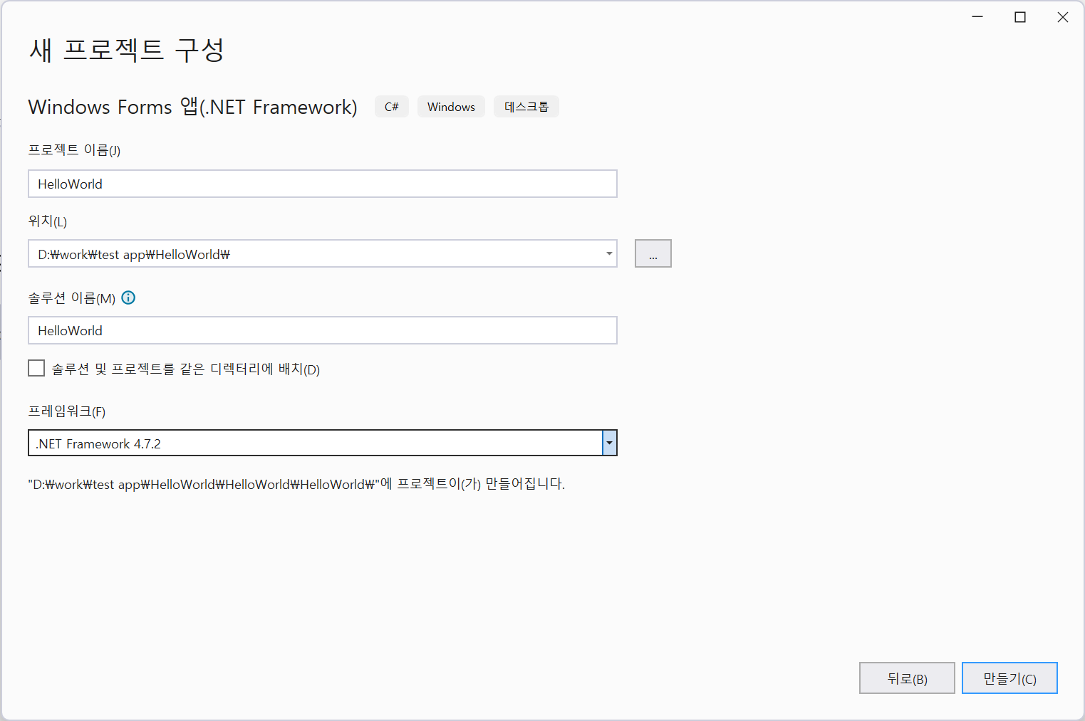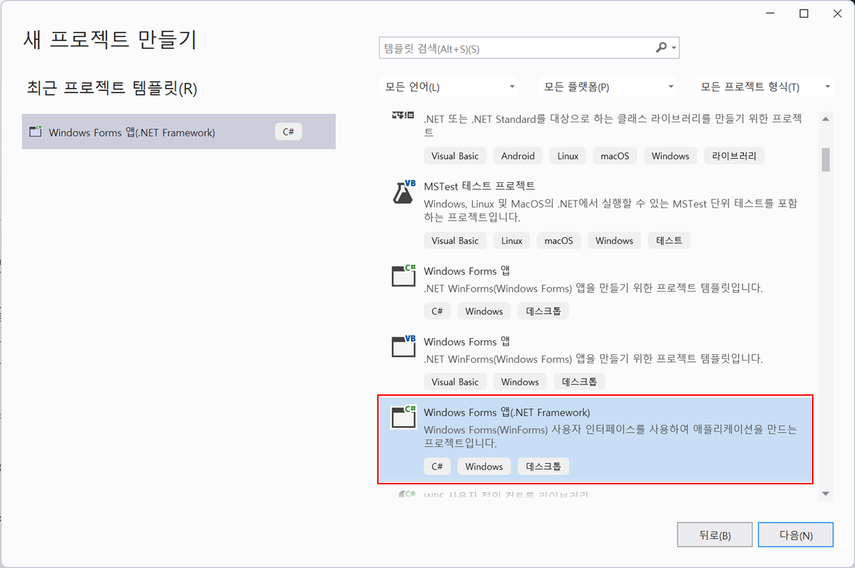 새 프로젝트 만들기 후 Windows Form 앱(.Net Framework) 를 클릭 하여 다음.