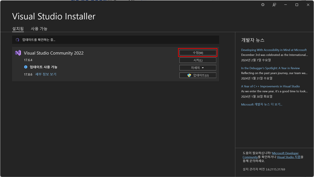우선 Visual Studio 를 설치하면 같이 설치되는 Visual Studio Installer 를 실행해주세요. 버전은 어떤 버전을 사용하셔도 무관합니다. 사용할 Visual Studio 우측에 수정 버튼을 눌러 워크로드 수정 페이지로 접속합니다.