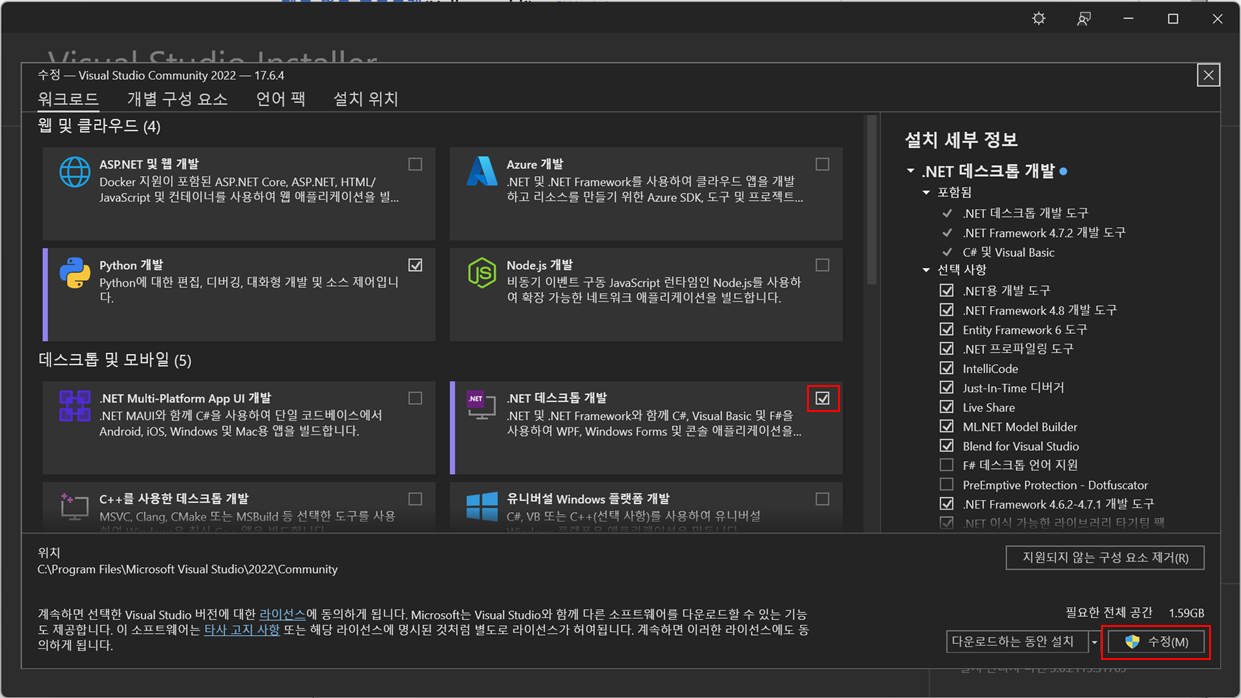 빨간 네모칸과 같이 .NET 데스크톱 개발에 체크후 수정 버튼을 클릭해 설치를 진행해주면 모든 준비는 끝이납니다.